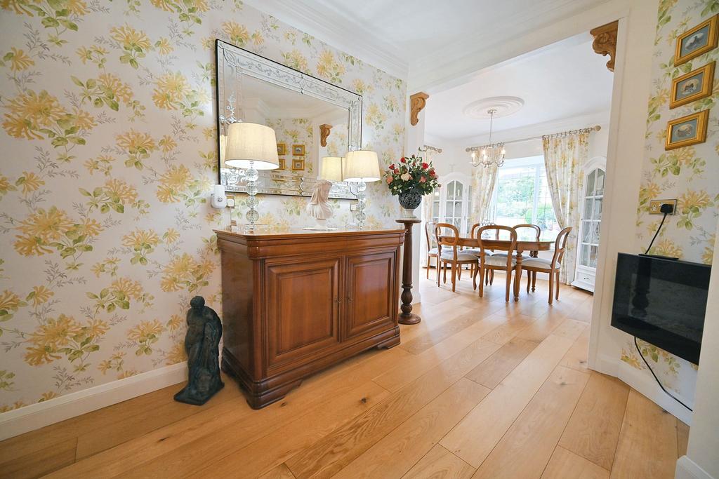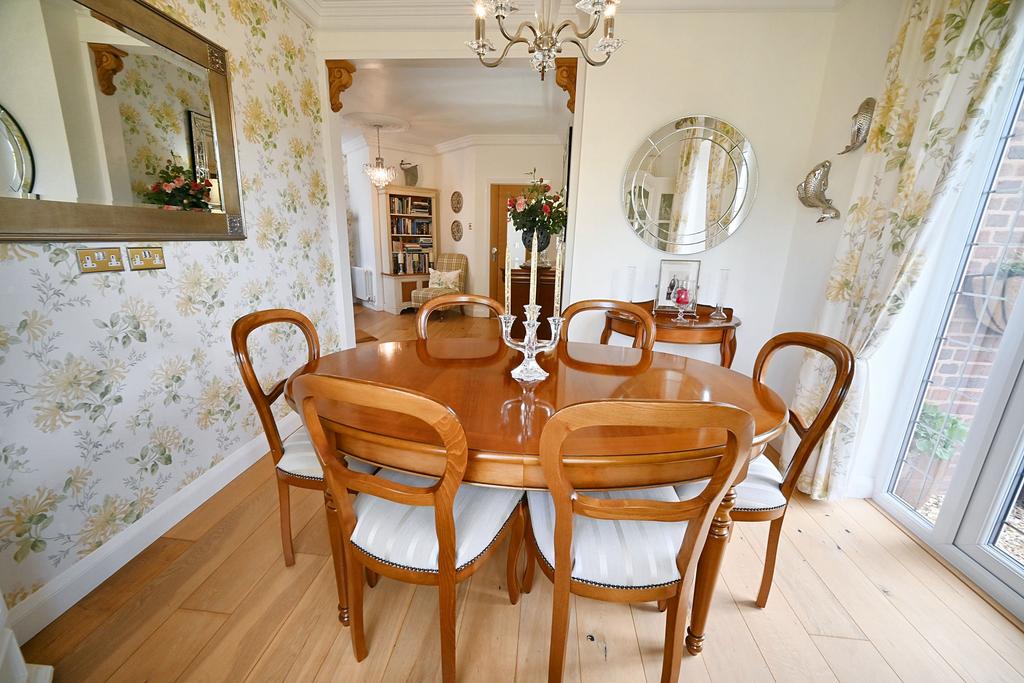 Dining Room: 9’11’’ (3.02m) x 9’4’’ (2.84m) Period style coved ceiling, engineered wood flooring with underfloor heating and double glazed leaded bow window to rear with matching side door.