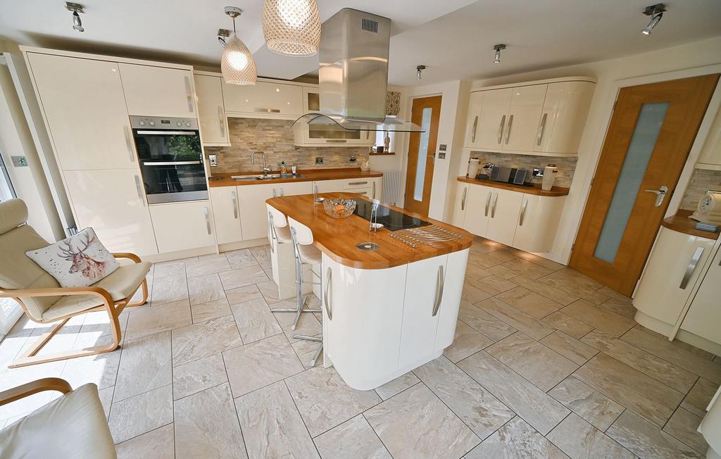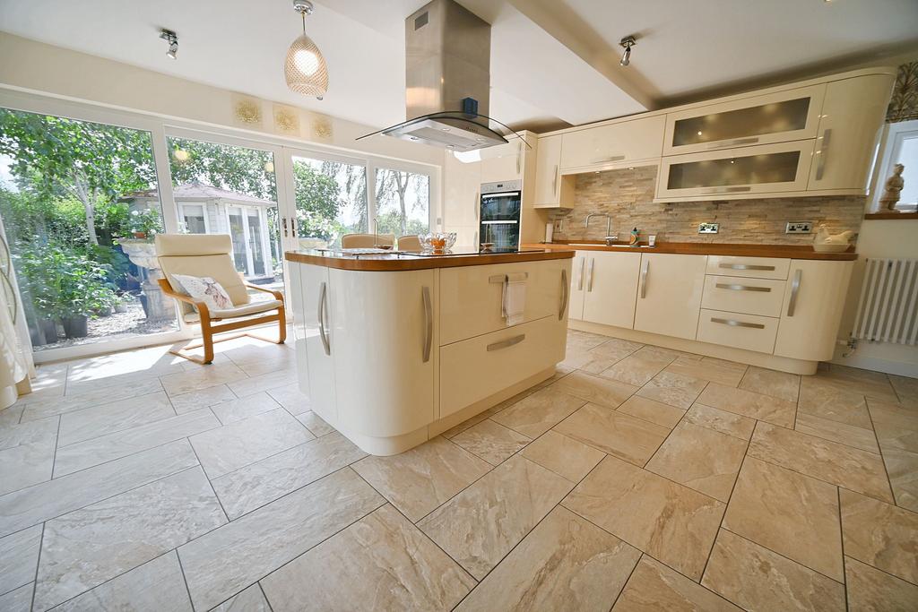 Breakfast Kitchen: 16’10’’ (5.13m) x 15’5’’ (4.70m) Fitted with a bespoke suite of matching light cream gloss units comprising an extensive range of built in base cupboards, drawers & suspended wall cupboards including pull out carousel organizer, hardwood worktops, matching central island/ breakfast bar with 4-ring induction hob with stainless steel extractor hood over, plinth & background lighting, built in appliances include double electric oven, fridge, freezer, ceiling spot lights, stone effect part tiled walls, three white modern style radiators, stone style tiled flooring, double glazed sliding door to side and matching full width double glazed picture window with double opening sliding doors. Utility Cupboard: Worcester central heating boiler, plumbing for dishwasher, suspended wall cupboards, stone style tiled flooring and double glazed window to rear.
