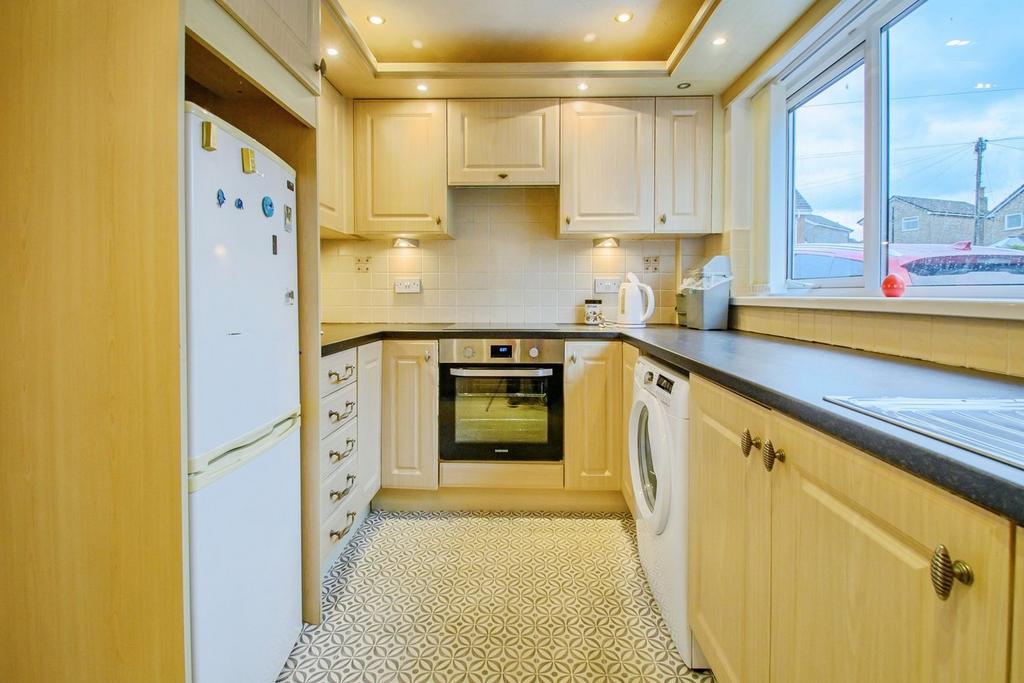 Kitchen - Fitted with a range of wall and base units with complementing worktops and underlights to the wall units, an inset stainless steel sink basin with a drainer and mixer tap, an integrated electric oven with a countertop electric hob and overhead extractor hood, space and plumbing for further appliances, a breakfast bar, a side aspect double glazed window, vinyl flooring, tiled splashbacks and recessed spotlights.