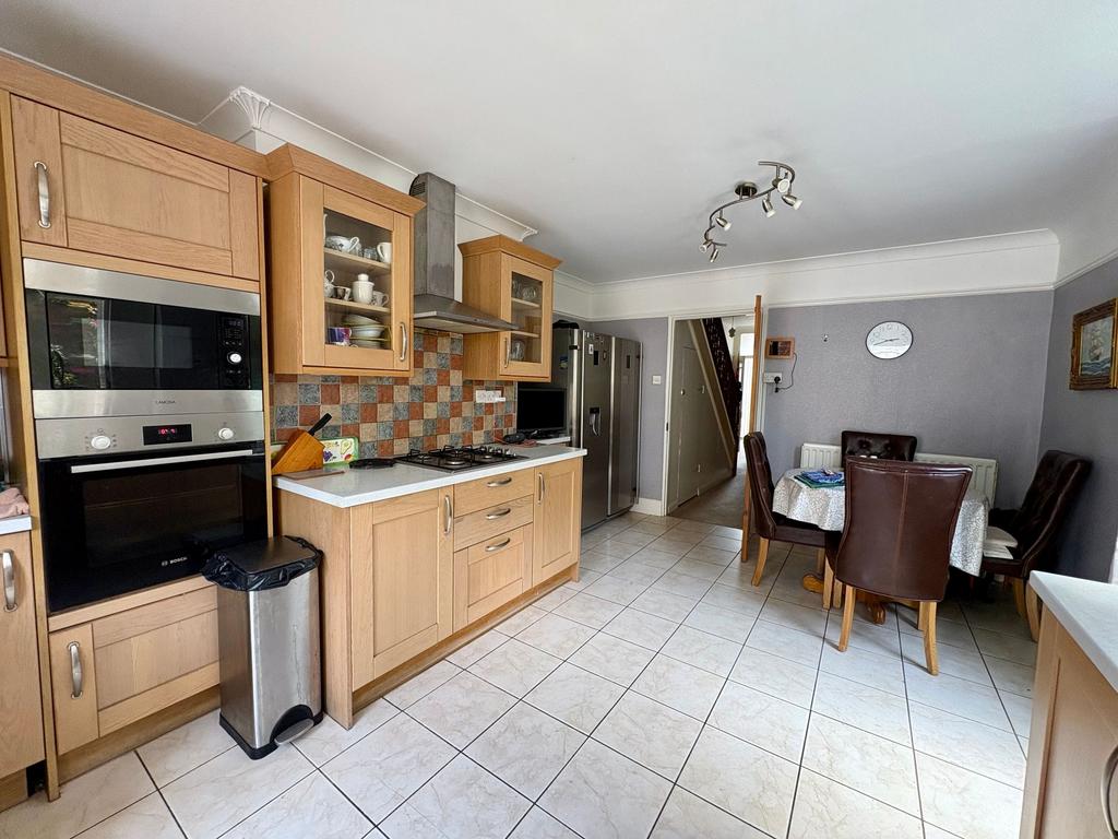 A front door with decorative glazed panels opens to the ENTRANCE PORCH with tiled floor and inner door to the RECEPTION HALL. The SITTING ROOM has two windows to the front and feature fireplace with fitted coal effect electric fire. DINING ROOM with wall mounted modern electric fire with alcoves to either side and window overlooking the rear garden. The KITCHEN/BREAKFAST ROOM is fitted with a range of wood effect units and square edged work tops with inset sink unit. Built-in double oven, four ring gas hob with extractor hood over, provisions for washing machine and space for American style fridge/freezer. Wall mounted gas fired boiler, two windows to the side, window and half glazed door overlooking and opening to the rear garden.