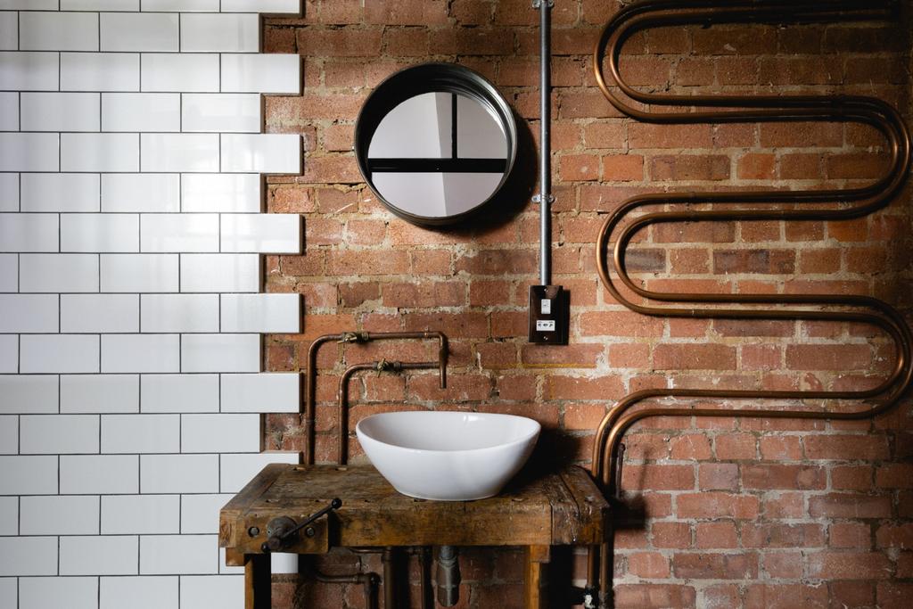 Adjoining the reception, an interesting internal room occupies a substantial portion of the apartment. Beyond the internal frosted windows lies a quiet sanctuary that’s half room half bathroom. Divided by a Crittall style internal screened wall, the bathrooms industrial finish is exemplary, bespoke conduits, pipe work and sanitary ware all feature heavily creating a unique environment.