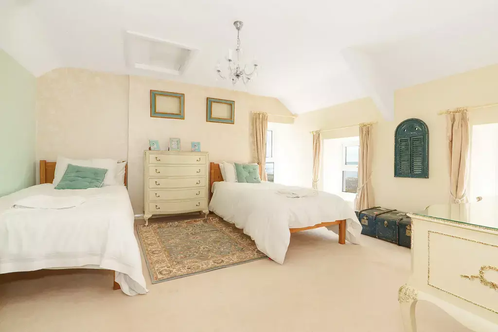 The generous accommodation extends to ten individually styled bedrooms, including six luxury en-suites and two family bathrooms, all appointed to an exceptional standard. The superb principal suite is a true highlight, offering sea views, a dressing room, and a striking en-suite bathroom with a freestanding bath.