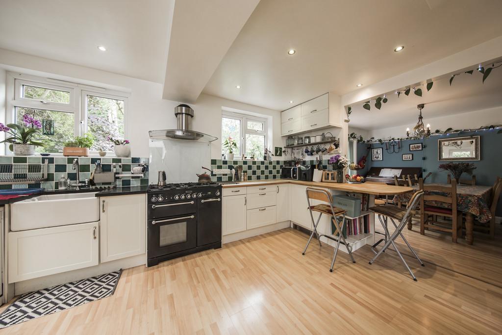 To the rear of the home, the spacious kitchen/diner is fitted with stylish Shaker-style units, solid wood work surfaces, and a classic Butler sink. There's ample space for a Range cooker beneath an extractor hood, along with room for a dishwasher and fridge/freezer. The adjoining dining area features wood-effect flooring and sliding glazed doors that open directly onto the south-easterly facing garden, allowing for easy indoor-outdoor living. A side door provides further garden access, and a wall-mounted boiler is neatly tucked away.