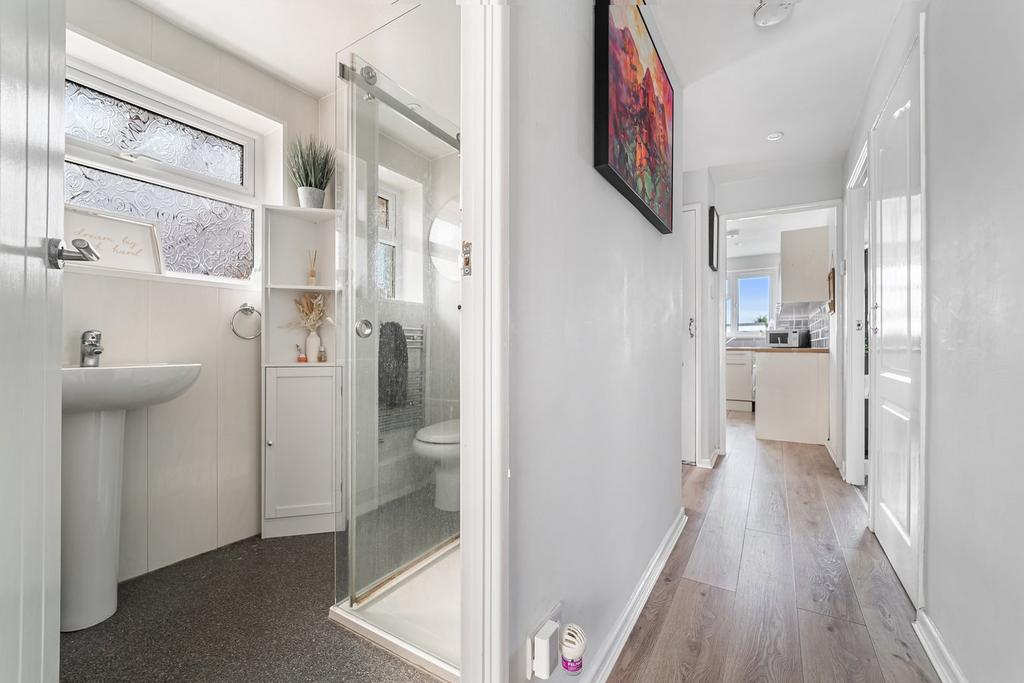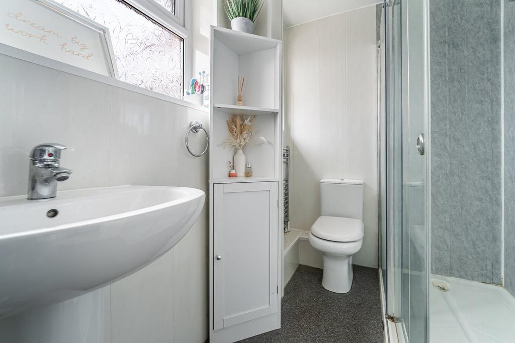 7' 9" x 5' 5" (2.36m x 1.65m) Radiator; Upvc double glazed window to side; white suite of WC, wash basin and a large shower.