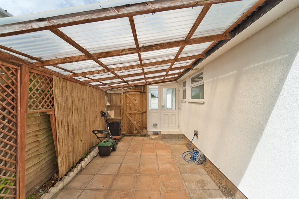 FRONT - Outside to the front there is an area of lawn in front of the bungalow and driveway parking leading up to the single garage and a pathway leads into the front courtyard where there is a timber door leading into a covered area to the side of the property.