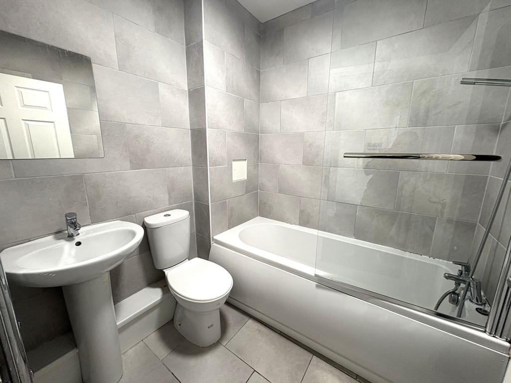 Tiled walls, plastered ceiling, tiled flooring, panel bath with over head shower, low level wc, pedestal sink and heated towel rail.