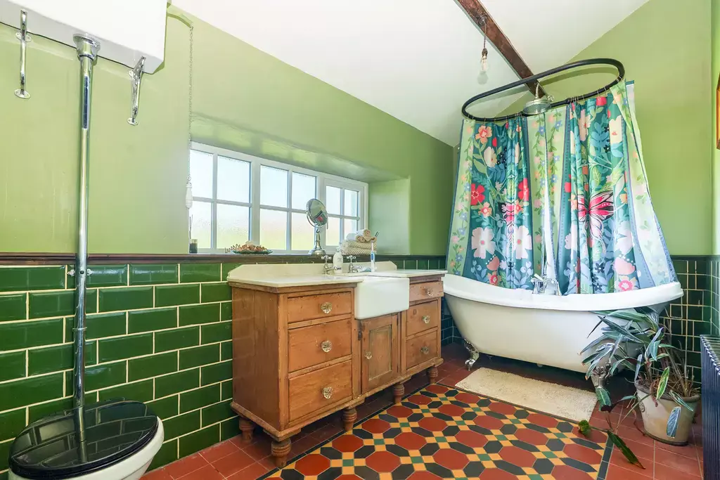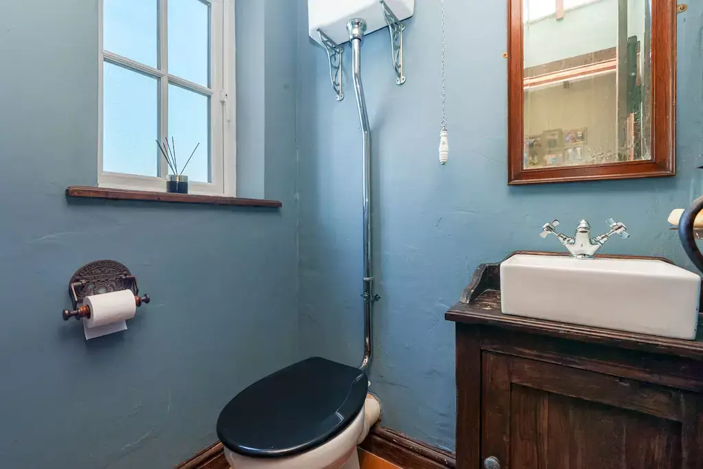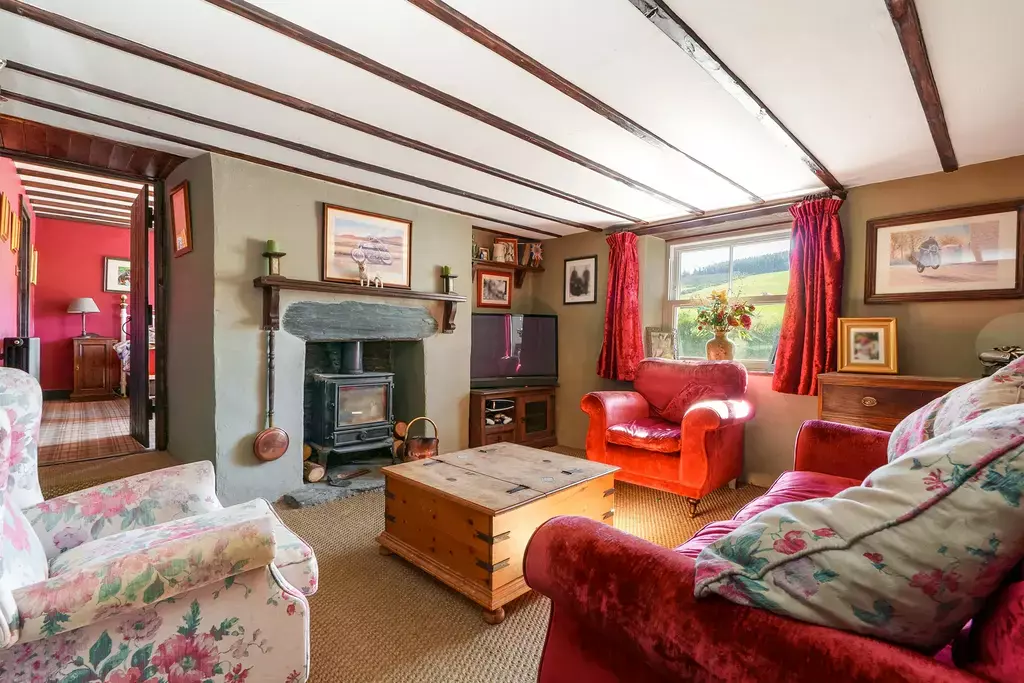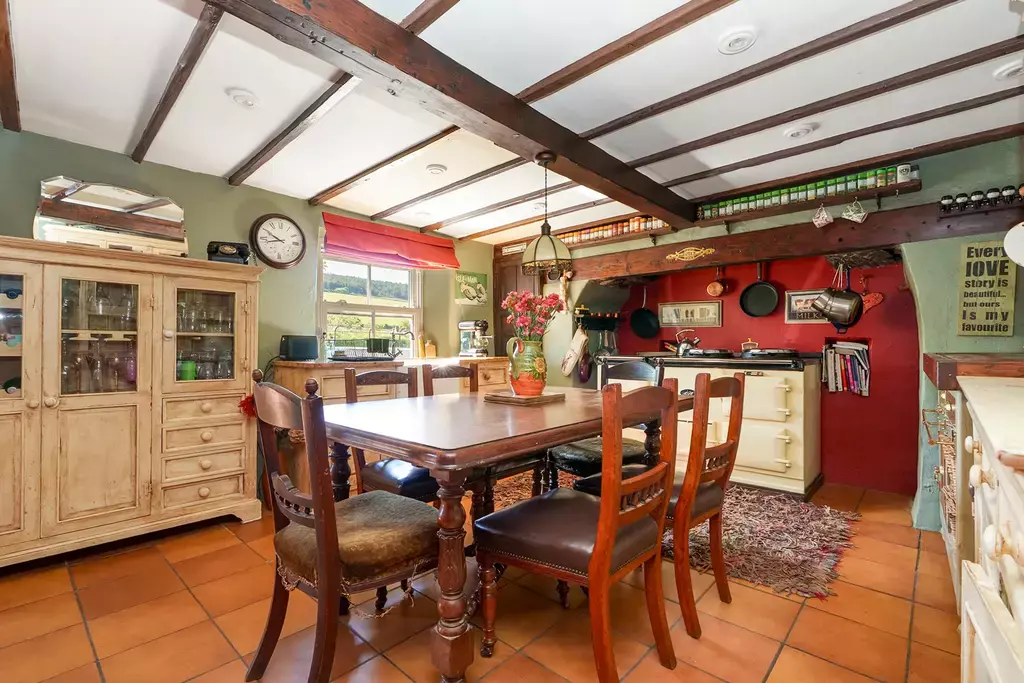Internally, Mount View Cottage exudes warmth and traditional character, with a wealth of period-style features such as exposed beams and rustic detailing throughout. The entrance porch opens into a charming dining kitchen, which centres around a cream electric Aga set within a beamed feature fireplace—a true heart-of-the-home feel. There is a cosy and characterful sitting room, and a striking living room extension with vaulted ceilings, exposed beams, and French doors opening to the garden, offering a perfect blend of classic and contemporary.
