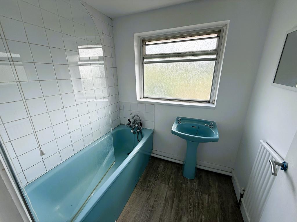 BATHROOMPanelled bath with electric shower and glazed shower screen over, pedestal wash hand basin, secondary glazed window to rear.