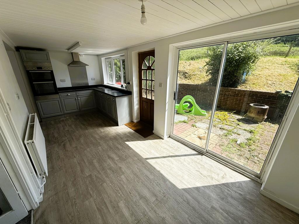 Double radiator, base and wall units, double glazed window to rear, glass panelled rear entrance door, 4 ring ceramic hob with extractor hood over, electric double oven, double glazed patio doors to rear and opening to: