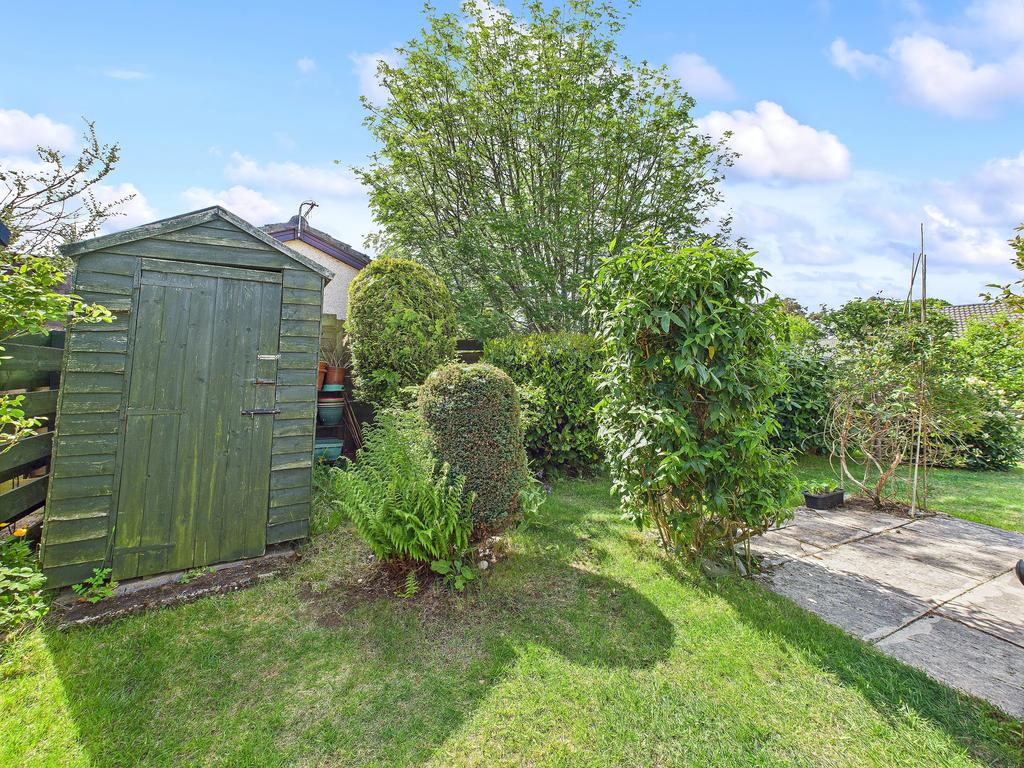 The front garden is mainly laid to lawn and bounded by a low level timber fence. The driveway leads to a single detached garage which benefits from a separate storeroom. A path leads to the main entrance door.
