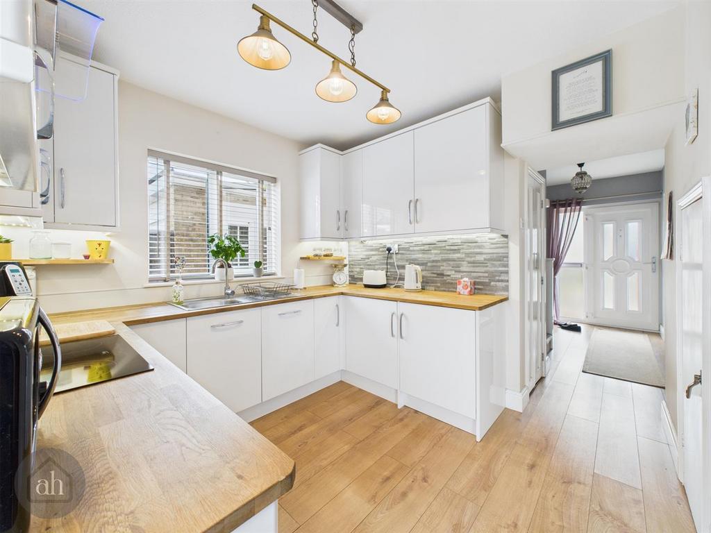 Kitchen - 9' 2'' x 9' 10'' (2.8m x 3.0m) - Stylish gloss kitchen with a range of base, wall and drawer units with wood work top over. Inset sink and drainer. Integrated washing machine, dishwasher and fridge. Double oven, ceramic hob and extractor fan over. Storage cupboard. Window to side and radiator.