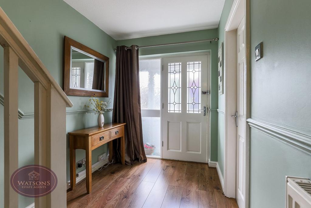 Stairs to the first floor, under stairs storage, wood effect laminate flooring, radiator and doors to the lounge and dining kitchen family room.