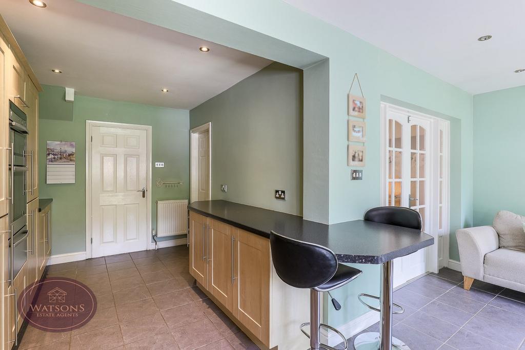 5.55m x 2.62m (18' 3" x 8' 7") A range of matching wall & base units, work surfaces incorporating an inset one & a half bowl stainless steel sink & drainer unit. Integrated appliances to include: double electric oven & grill, 5 ring gas hob with extractor over, fridge freezer, dishwasher. Radiator, cupboard with plumbing for washing machine, ceiling spotlights, cupboard housing the combination boiler, breakfast bar, tiled flooring and open to the family area.