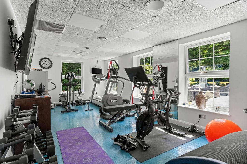 The private leisure wing has been thoughtfully designed as a sanctuary of wellness, indulgence and complete relaxation. At its heart, an elegant infinity pool extends toward the lush gardens, offering uninterrupted views. Adjacent to the pool, is a fully equipped gym, sauna and steam room. On either side of the leisure suite, doors can be swept open during the summer months to create an indoor/outdoor experience.