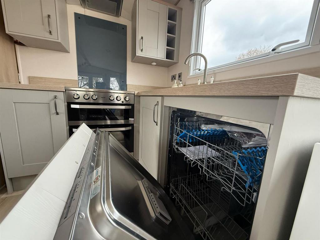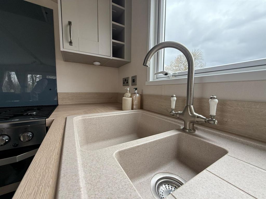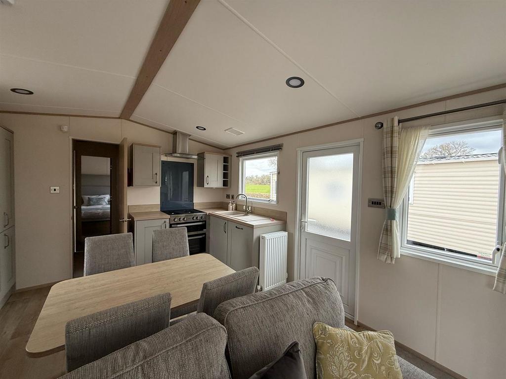The side doorway brings you in to the open plan living area. The fully fitted kitchen has a plenty of worktop space and a dining area for 4 people. The space takes advantage of the light flooding in from the large patio doors. The lounge area has 2 large sofas (3 seater and a 2 seater) one of which is a sofa-bed, perfect for family staying over. No lease length on these properties.