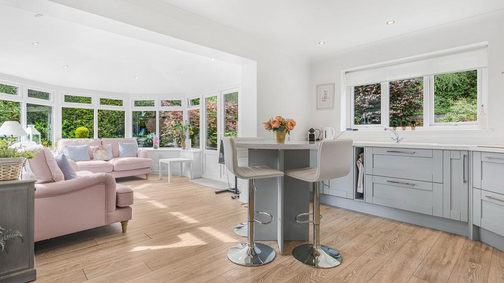 Breakfast/Kitchen with Garden/Family Room Painted style units with integrated appliances. Inset 1 ½ bowl sink, floor cupboards and drawers, work surfaces. Housing unit with built in oven, microwave and warming drawer. Fridge/freezer to side. Inset 4 ring hob with extractor hood above and built in dishwasher. Bow fronted display unit, laminate flooring, designer radiator, circular breakfast table and window overlooking the rear garden. Further windows overlooking the gardens to side and rear and French doors to the patio. Two further radiators in garden/family room.