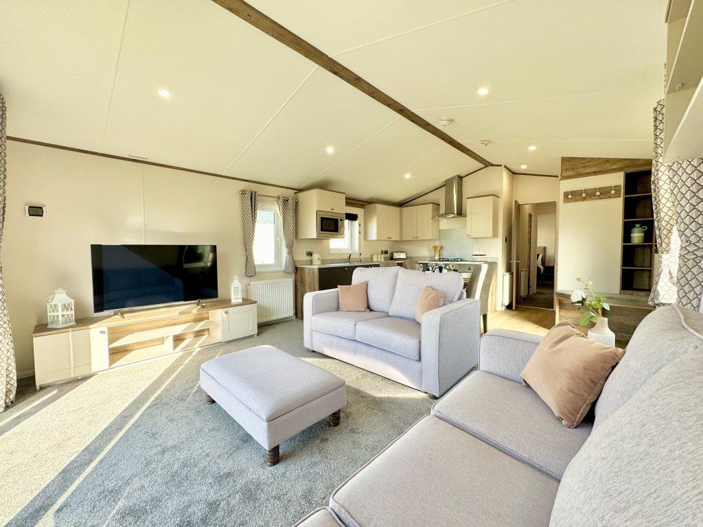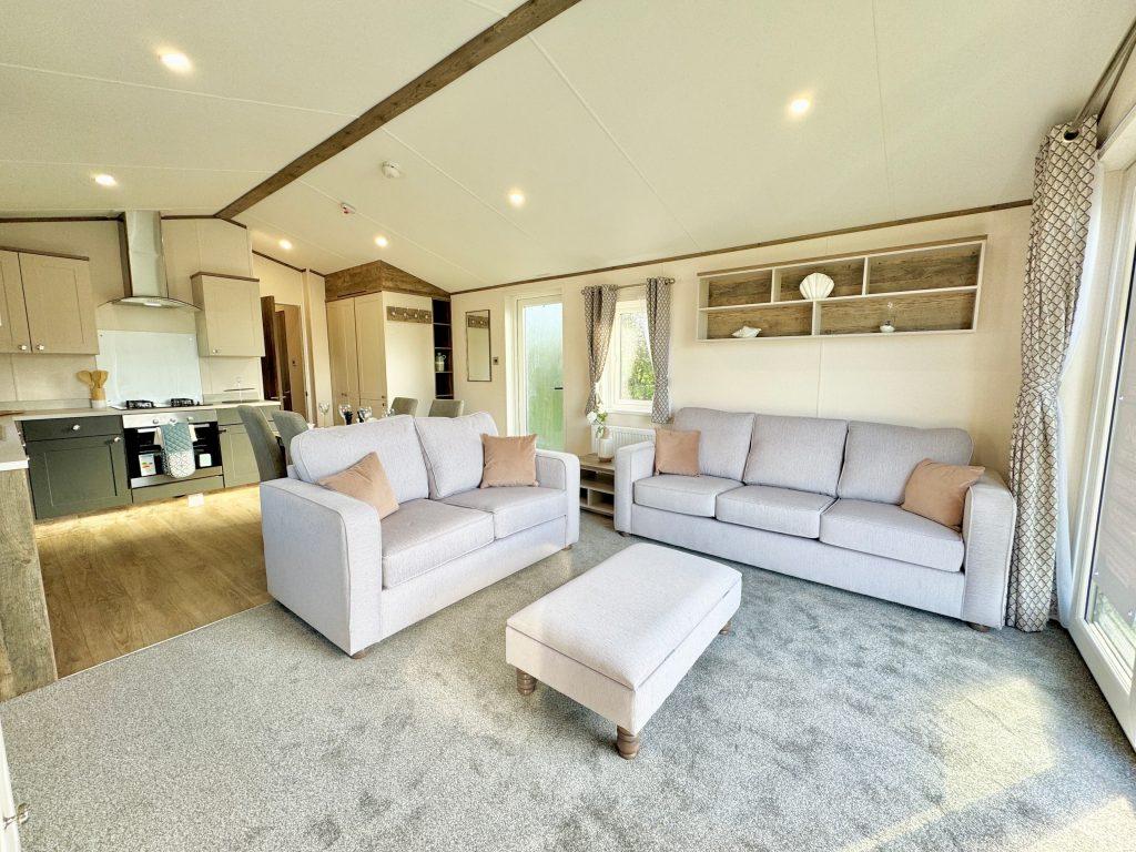 Welcome to this beautifully appointed brand new villa, located in the tranquil and exclusive Owners-Only Oaklands Holiday Park. Designed with comfort and style in mind, this spacious holiday home is perfect for relaxed getaways, family breaks, and long summer stays on the Essex coast. | Step into a beautifully bright and welcoming lounge, designed with comfort and style in mind. This expansive open-plan space boasts two generously sized, freestanding sofas in a soft, neutral palette—perfect for relaxing with family or hosting friends. A coordinating upholstered footstool adds a touch of luxury and convenience, while bespoke open shelving offers both character and practical display space for personal touches.