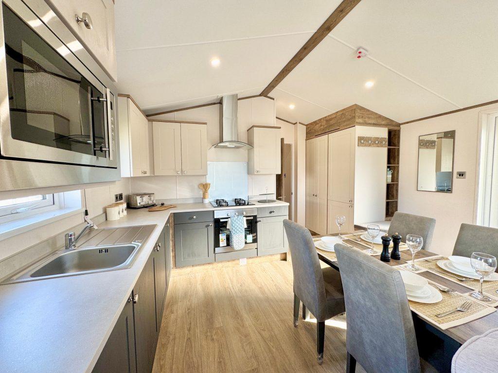 The heart of the holiday home features a chic shaker-style kitchen, finished in an elegant two-tone combination of graphite and cashmere cabinetry. Equipped with high-spec integrated appliances—including a gas oven and hob, extractor fan, microwave, and a freestanding fridge-freezer—this kitchen offers everything you need for everyday ease or culinary creativity.