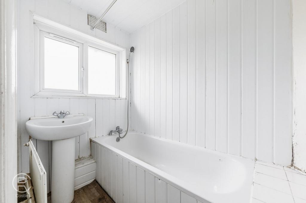 Rear aspect window, panel enclosed bath with pedestal wash hand sink, radiator , separate WC
