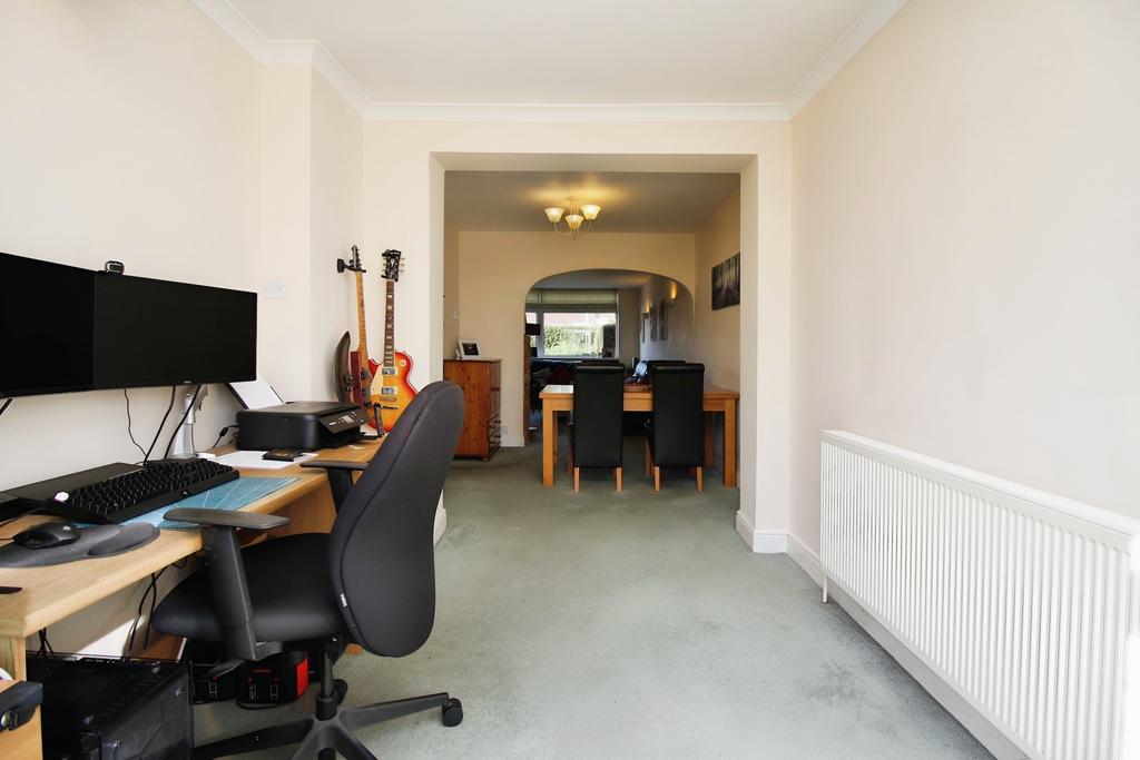 Upon entry to the accommodation you step into the welcoming entrance hallway offering a staircase rising to the first floor with useful storage space under. A door leads through to the primary reception room flooded with an abundance of natural light provided by a walk in half bay window to the front elevation. With a feature log burner, carpet flooring and open access through to the formal dining room which has been enlarged to offer further sitting space, perfect for families and boasts French doors opening out into the rear garden. Completing the ground floor is the extended kitchen fitted with a range of wall mounted and base units with complementary work surfaces over, inset 1.5 sink and drainer with mixer tap, built in oven, four ring gas hob and space for two appliances. Enjoying light provided by dual aspect glazing, there is a useful storage cupboard and ample space for a breakfast table and chairs.