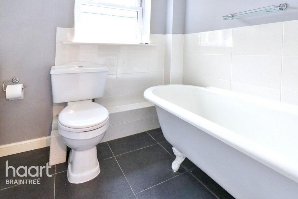 Low level WC, pedestal hand wash basin, roll top bath with clawed feet, double glazed window to the side, tiled floor, built in speakers and heated towel rail.