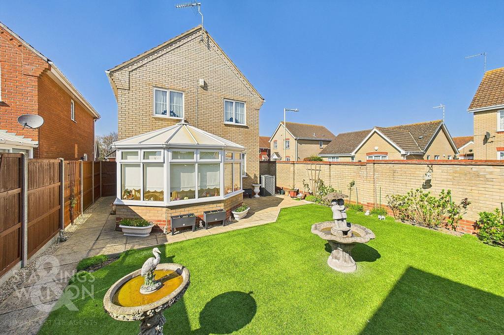To the rear of the property a private and brick wall enclosed garden offers a patio area ideal for outdoor furniture providing a sunny social space in the summer months. Storage space is tucked to one side of the garden, and a shingle bordered walkway offers gated access to the driveway and garage. The remainder of the garden is predominantly laid to synthetic grass with a wraparound flower bed running the perimeter of the lawn.
