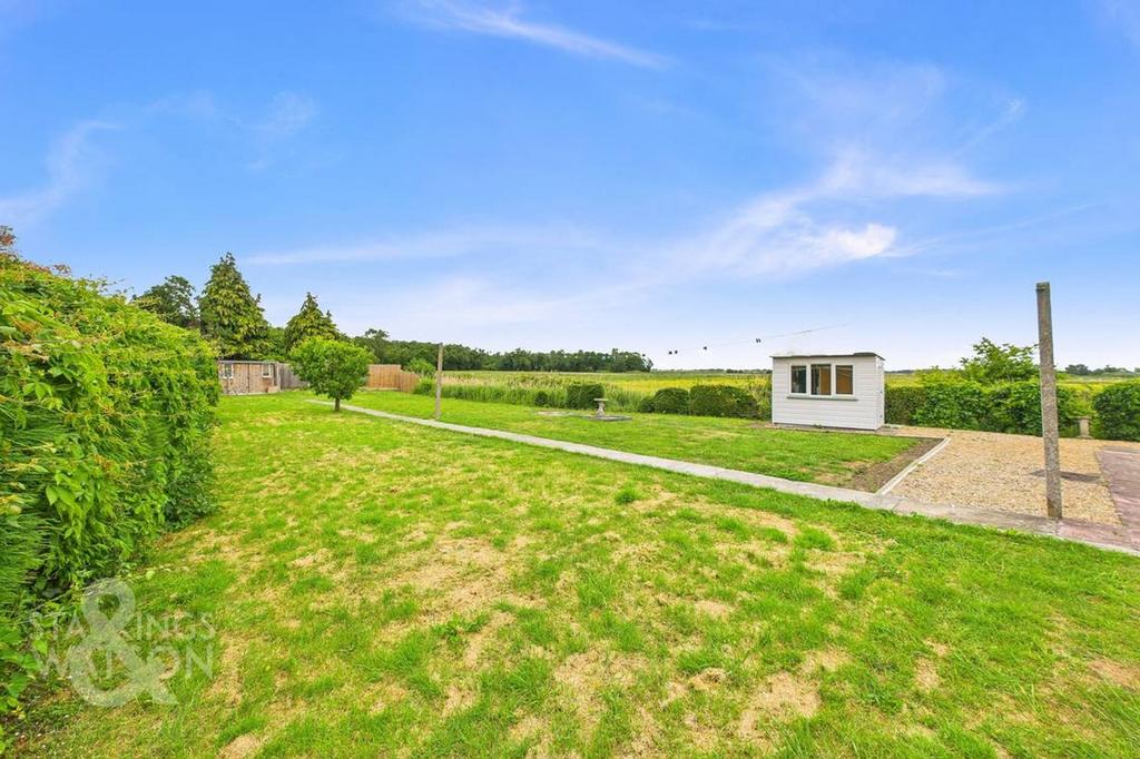 The rear garden is mainly laid lawn and includes a hard standing footpath which runs down the garden. Timber panel fencing and mature hedging can be found to the boundaries, with an open aspect over the adjacent marshland and fields. Two timber shed offer storage with various shingled seating areas. Gated access leads to the driveway, where an area ideal space for decking or patio has been created, with potential for a new owner to progress with the project. The garage building offers a two hinged door to front, window to side, door to side, power and lighting.
