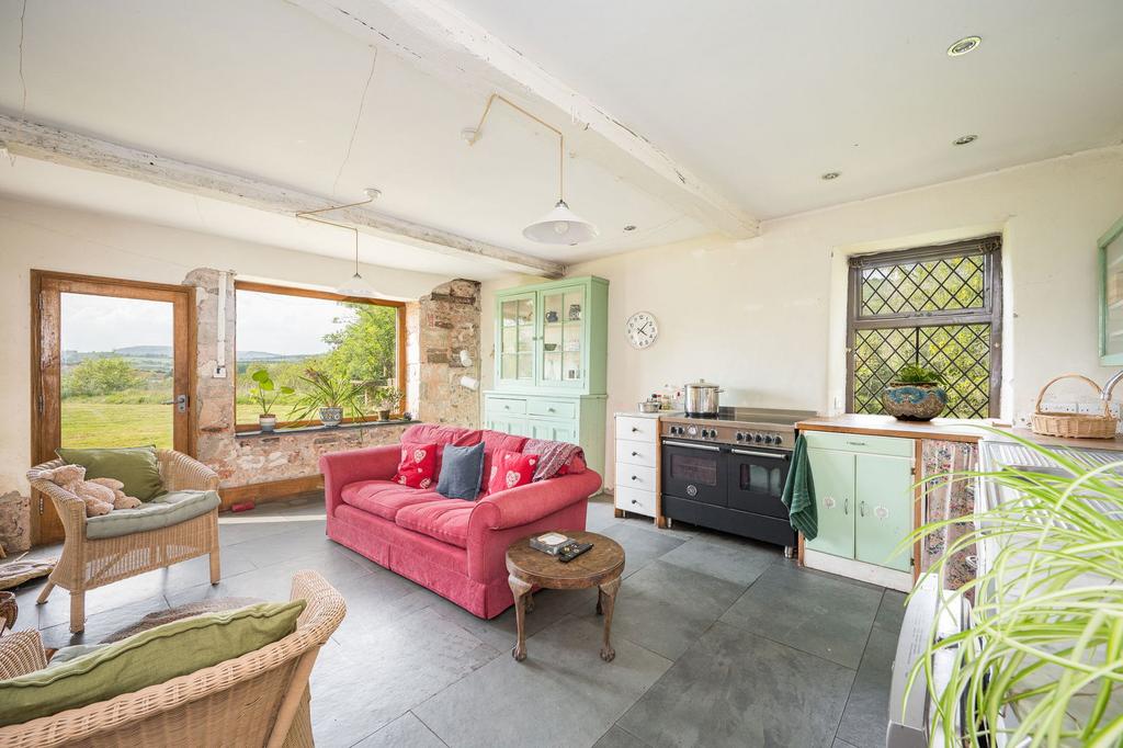The sitting room is a beautiful space and boasts flagstone flooring, a wood burning stove and large windows framing the superb views across the garden and countryside beyond. A door leads down to the cellar with vaulted ceiling.