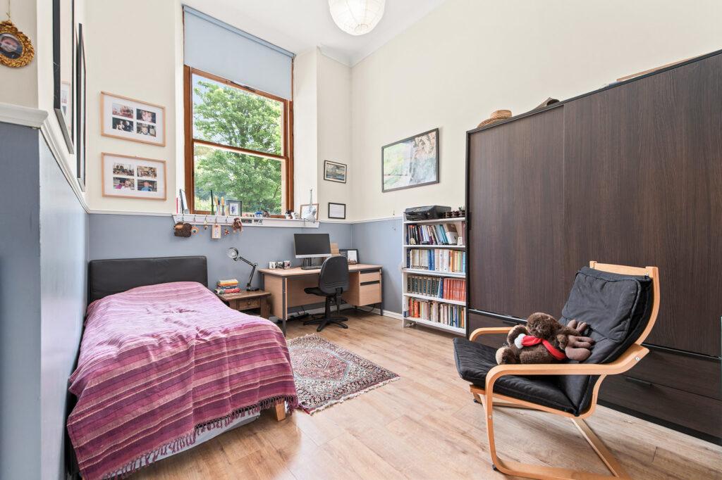 Extremely bright and spacious, triple aspect room with focal wood burning stove, solid wood flooring, two radiators, five windows, and TV point. Double doors to the hallway and single door to the kitchen.