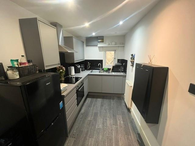 - Kitchen with integral appliances and lounge with exposed brickwork