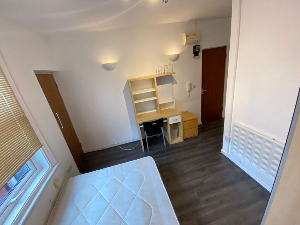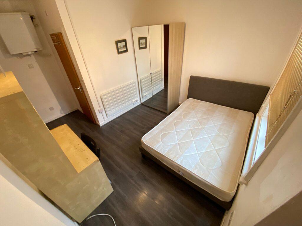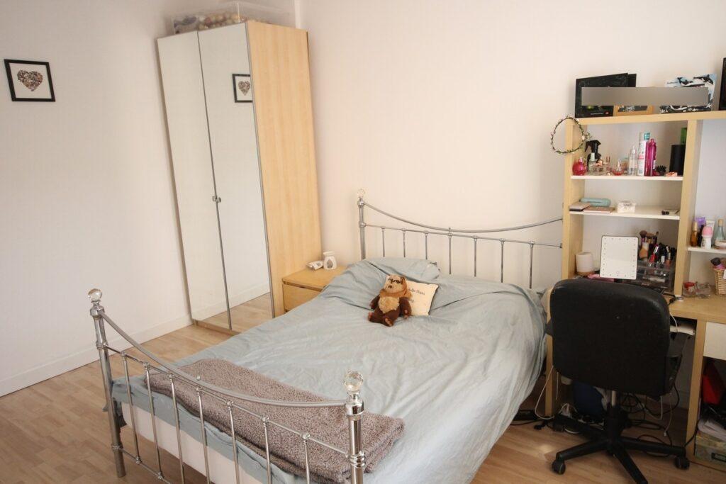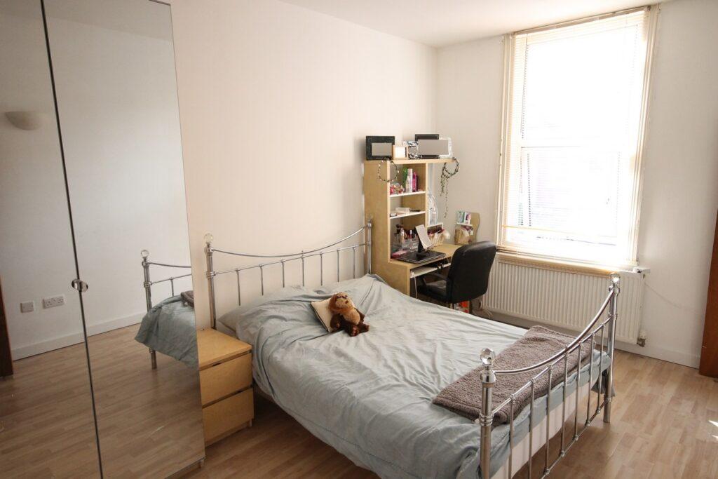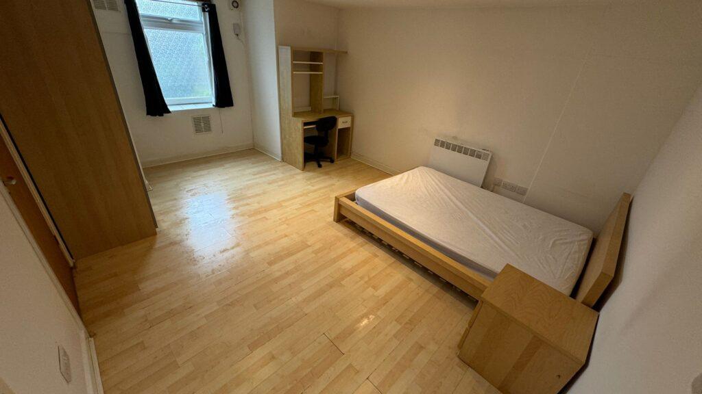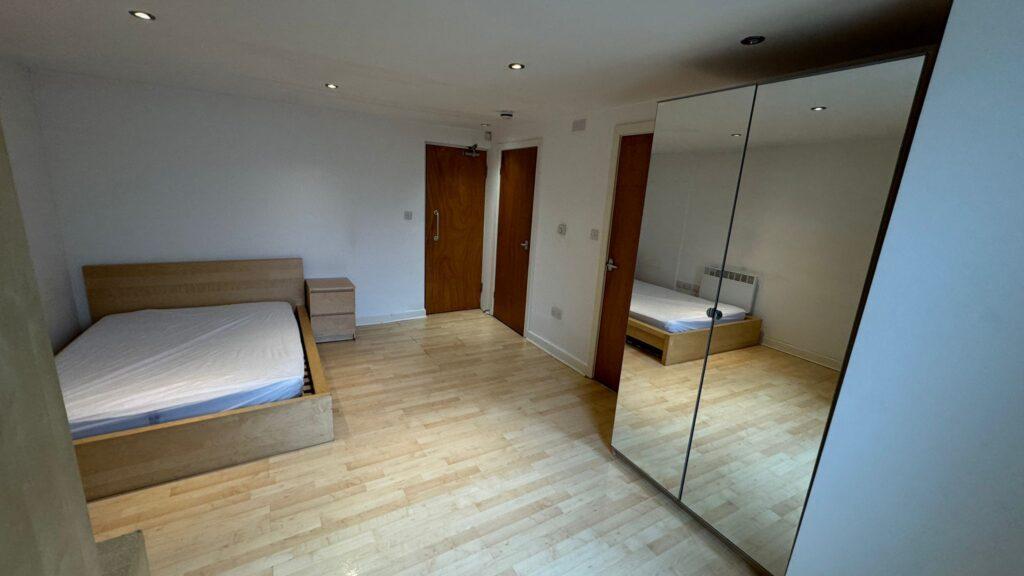 BEDROOM: The first flat includes a spacious and neutral bedroom with a double bed, bedside table, mirrored wardrobe, desk and chair, as well as a large window for a bright and airy feel.