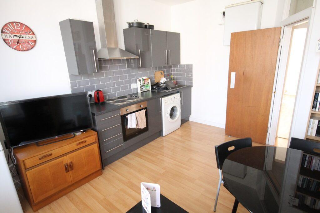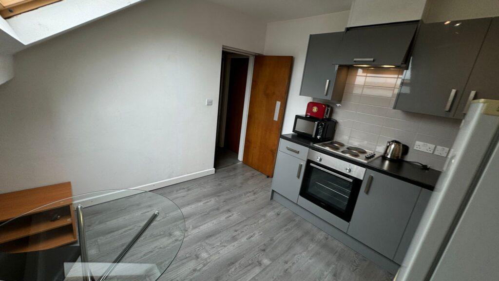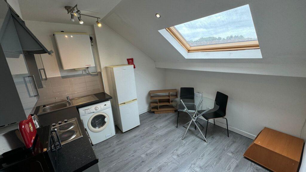 LIVING ROOM/KITCHEN: The separate living area features a grey kitchen unit with an integrated hob/oven, under-counter washing machine, extractor fan and fridge/freezer. A dining table with chairs, sofa, bookshelves and coffee table are included, naturally lit by a large window.