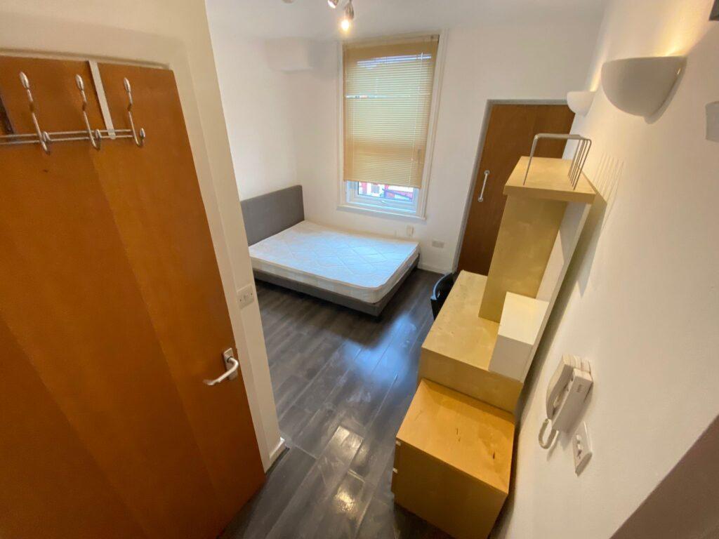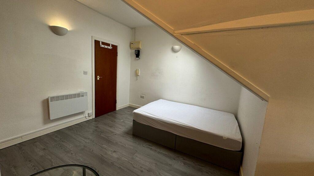 BEDROOM: The third flat features dark brown lino flooring and white walls, with a black metal framed double bed, bedside table, desk, chair, shelving and mirrored wardrobe. With plenty of storage options, this room is also brightly lit by a window.