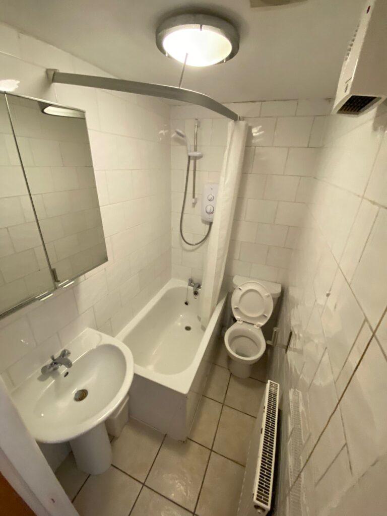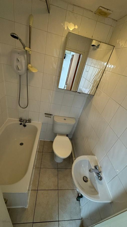 BATHROOM: The en-suite bathroom is fully tiled and includes a wash basin, W.C. and bath/shower combination, as well as a large mirror cabinet and extractor fan for ventilation.