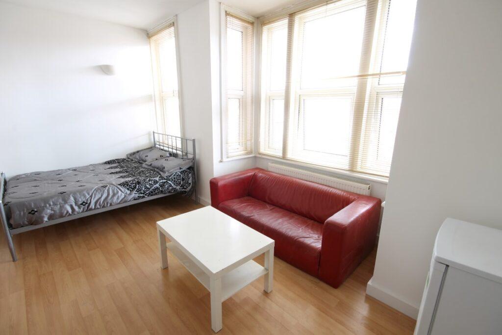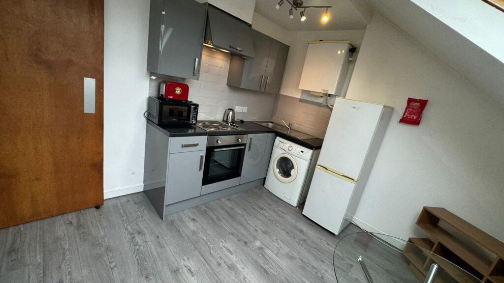 LIVING SPACE: This open-plan studio with wood-effect laminate flooring and white walls includes a metal framed bed, desk, bedside table, mirrored wardrobe, red sofa and white coffee table for comfort. The grey kitchen unit includes an integrated hob/oven, extractor fan, under-counter washing machine and a fridge with ice box.