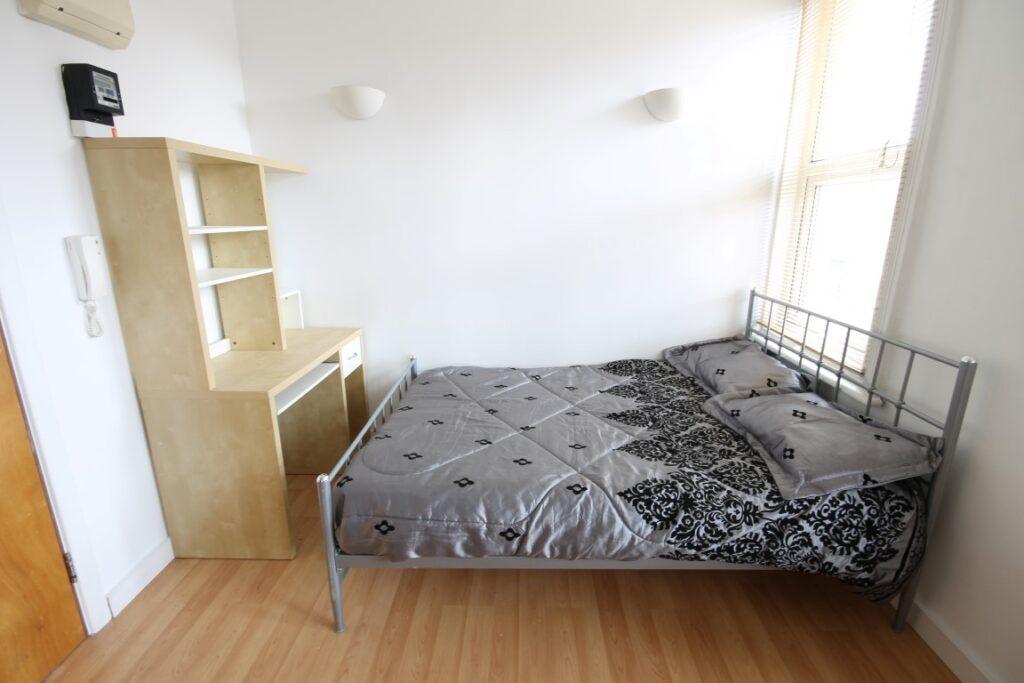 BEDROOM: The second flat features a similar bedroom with the same décor, and includes a double bed, bedside table, mirrored wardrobe, desk and chair. A large window fills the room with natural light.