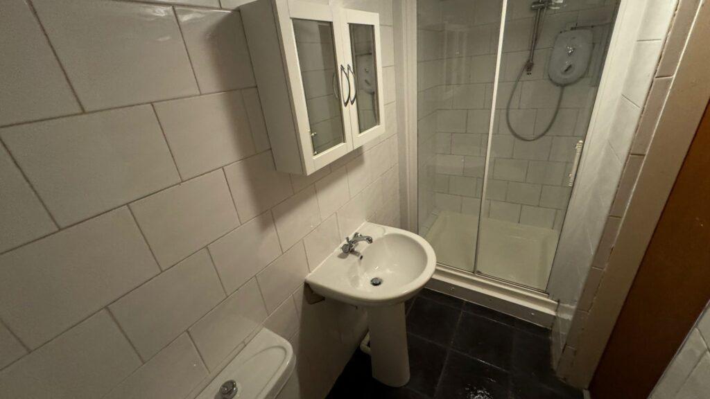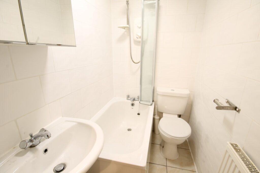 BATHROOM: The en-suite bathroom is fully tiled with a white 3-piece suite, including a wash basin, W.C. and walk-in shower cubicle, as well as a storage cabinet and extractor fan.