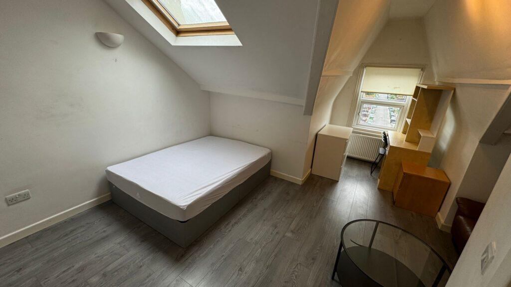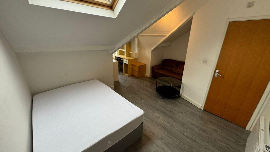 BEDROOM: On the top floor is the last flat with neutral décor and plenty of space. The bedroom is furnished with a double bed, sofa, coffee table, bedside table, desk, chair and chest of drawers, and the space is naturally lit by two windows including a Velux.