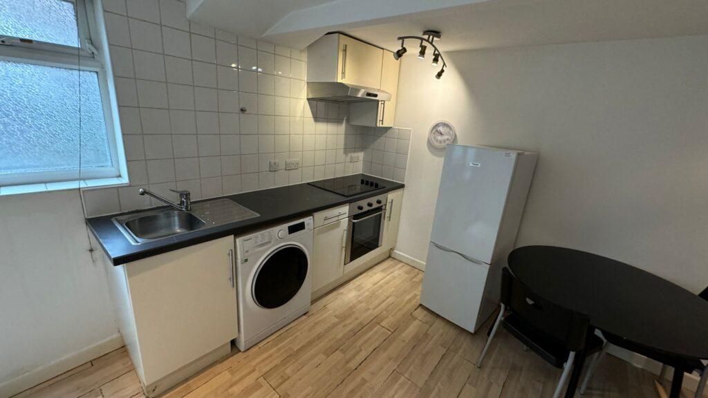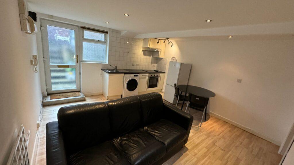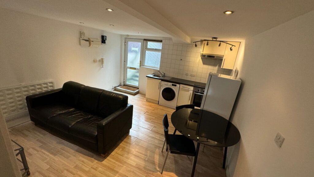 LIVING ROOM/KITCHEN: In a separate room is the open-plan kitchen/living room with matching décor, with a sofa, dining table, coffee table, white cabinets, tall fridge/freezer, under-counter washing machine and integrated hob/oven with extractor fan. A door in this room provides the flat with its own entrance for convenience.
