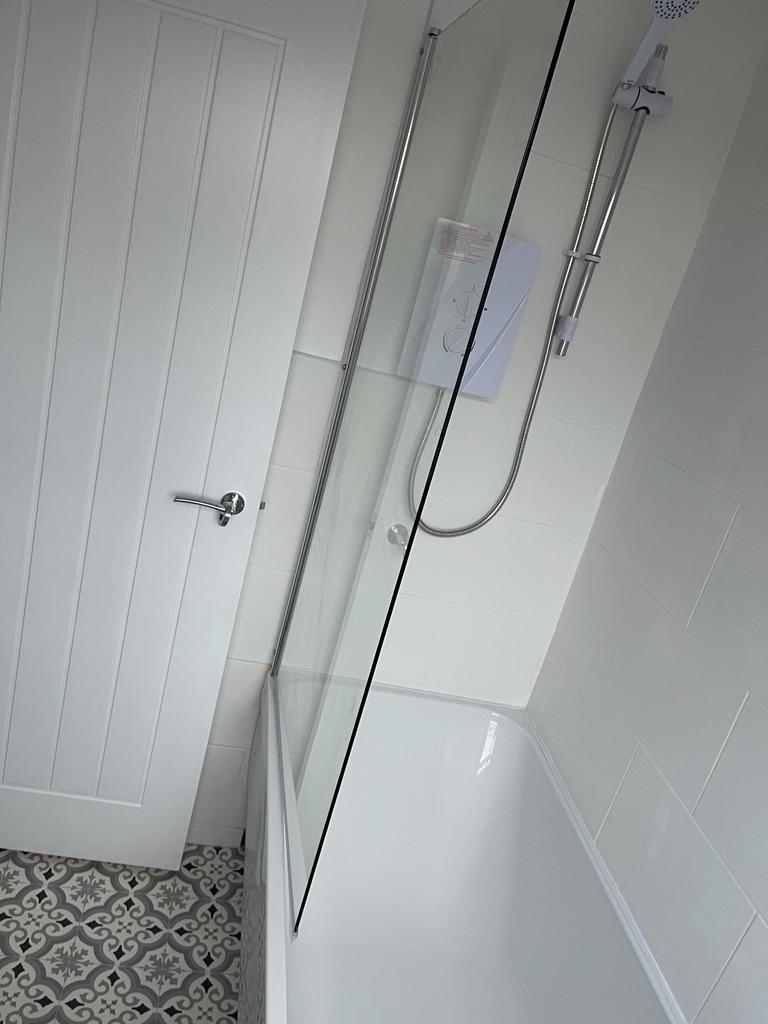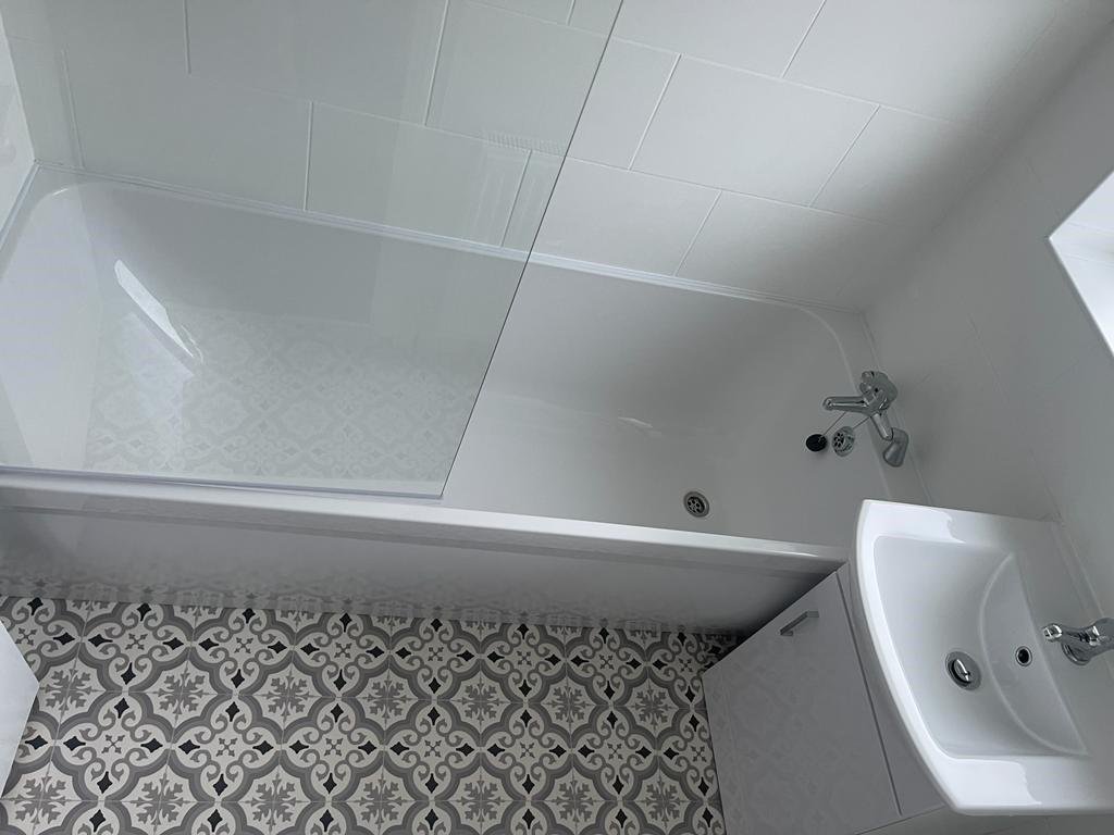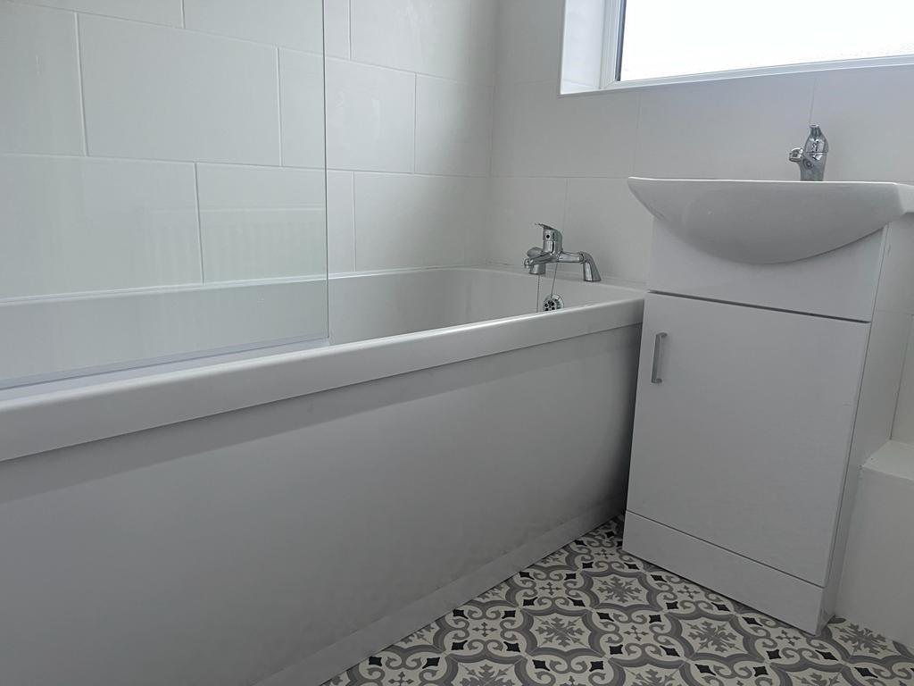 White suite comprising of bath with shower over and wash basin, single glazed window and radiator.
