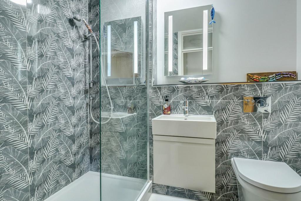 A part tiled room comprising walk-in shower with glass screen, low level W.C. with concealed cistern and a wall mounted wash hand basin with storage beneath. Towel radiator. Extractor fan.