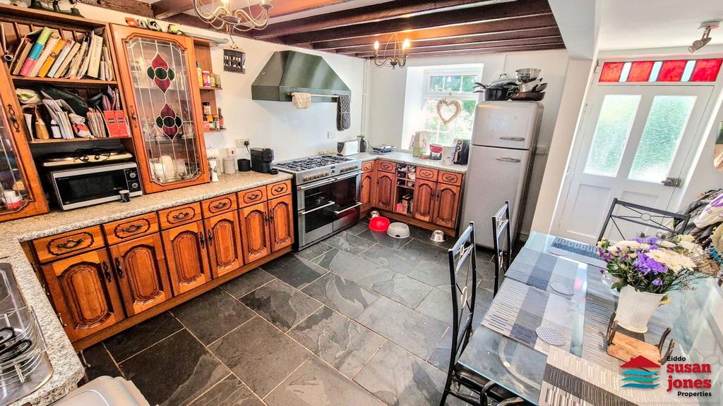 - Lolfa, cegin, ystafell fwyta, iwtility a 2 ymolchfa