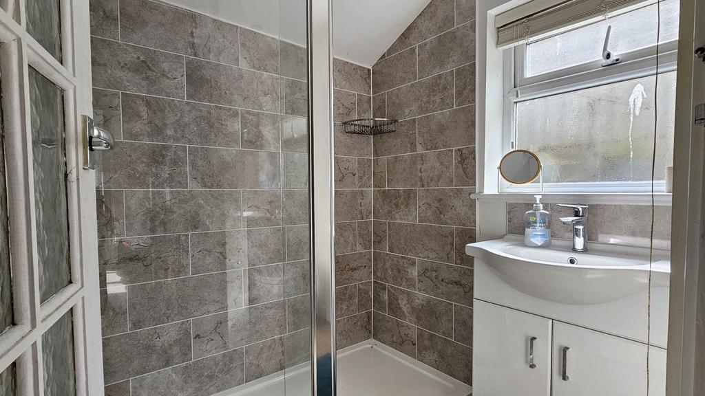 Upstairs, the first floor landing opens to 2 bedrooms and the family bathroom. The main bedroom is a generous double, found at the front of the home, with a large bay window enjoying panoramic views of the coast and a fitted shower. The second bedroom is a good-sized double found at the rear. The bathroom is fitted with a white suite comprising a bath with shower over, low-level W.C, wash basin with a vanity unit below and a heated towel rail.