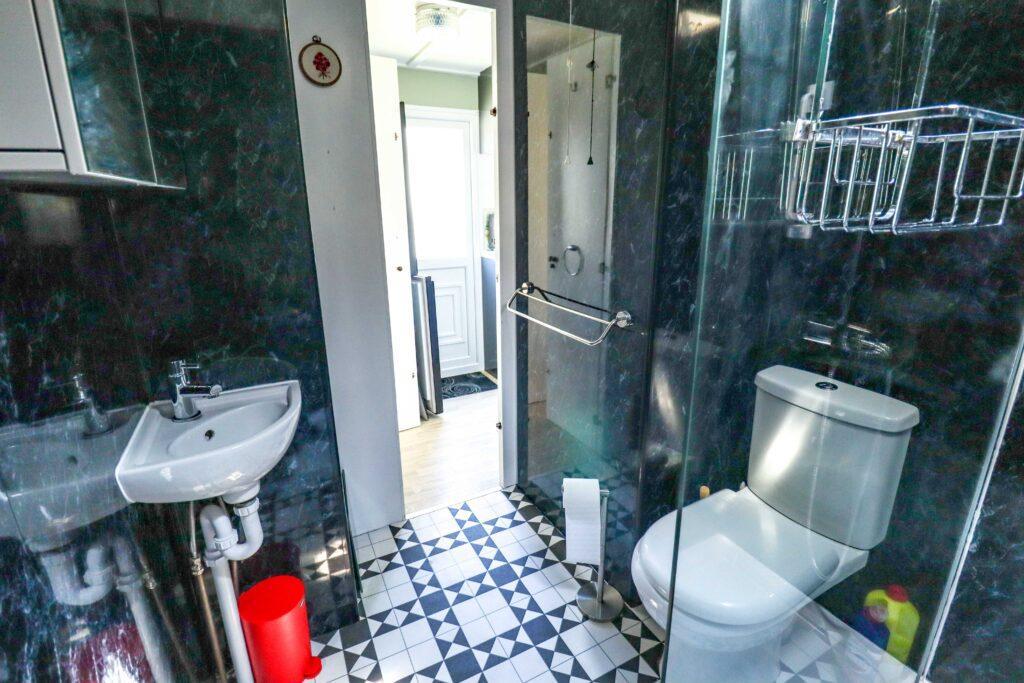 Fitted with an attractive white suite. Low level WC. Wash hand basin. Wide fully tiled shower enclosure with a drencher shower. Small sky light. Walls fully tiled. Fitted cabinet with a mirrored front.