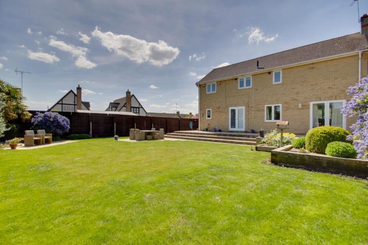 To the rear and side of the property are enclosed gardens, with large, paved pathways, patio seating areas, large lawn areas, and established mature flower bed borders.