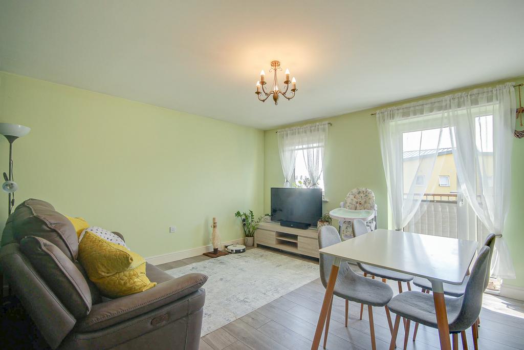 The heart of the apartment is the living room with a kitchen complementing the open-plan design. It is fitted with modern appliances, ample storage through wall and base units & shelving, and a stylish gas hob and oven. The main feature of the living space is the south-facing balcony, allowing residents to enjoy the outdoors while being in an apartment block.
