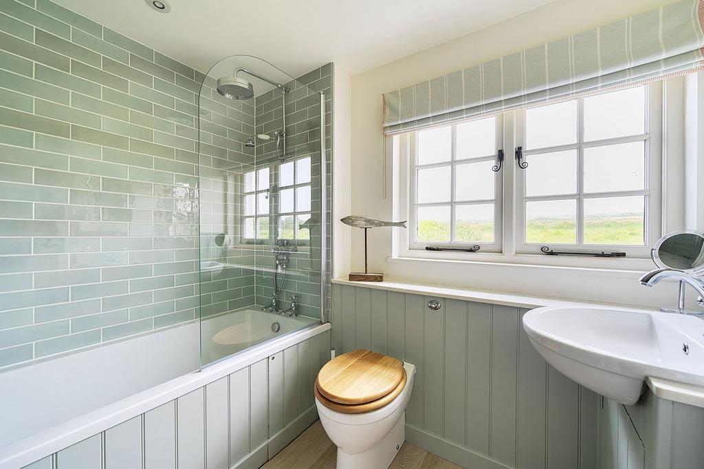 Suite comprises of bath with rainfall shower over and handheld shower attachment, washbasin/vanity unit and WC. Tiled surrounds with feature timber panelling to walls. Timber, double glazed window to rear overlooking fields. Heated towel rail. Three built-in storage cupboards. Vinyl floor.