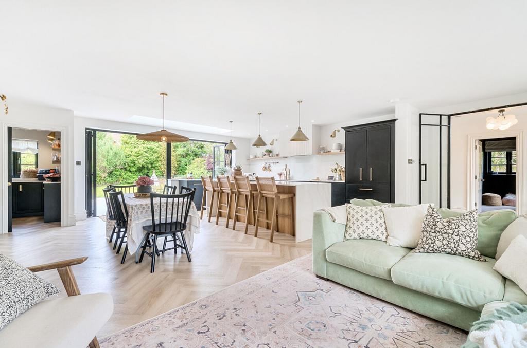 A striking architectural feature of this space is the set of bi-fold doors that lead out to a stone patio and adjacent bi-fold windows that open onto an external breakfast bar, blurring the line between inside and outside living. Together, they create a sociable, al fresco-style connection to the garden—ideal for family meals, relaxed gatherings, or summer entertaining.