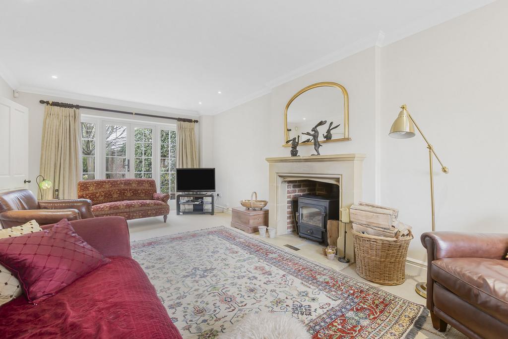 This unique property was designed by a local architect in the 1960's and has been extended to create a spacious family home with an abundance of natural light. The ground floor comprises; oak porch, generous entrance hall, drawing room with fireplace and built-in cupboards, currently used as a study. The dual-aspect drawing room has underfloor heating, a stone fireplace with wood burning stove and French doors to the garden. The kitchen/dining/family room is at the heart of the property providing a generous space for living and entertaining with underfloor heating, triple aspect windows and French doors leading to the garden. The kitchen has shaker-style fitted units with a range cooker, built-in dishwasher, microwave and fridge. The utility room leads to the rear lobby/boot room with access to the garden and cloakroom.