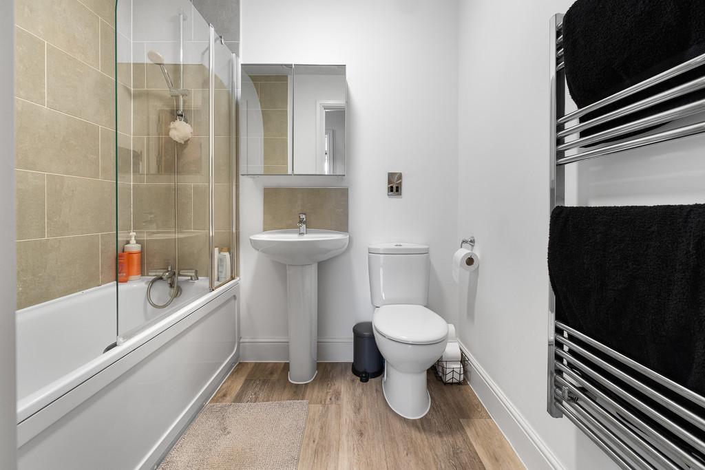 BATHROOM 6' 10" x 5' 6" (2.09m x 1.70m) Wood effect laminate flooring. Part tiled walls. Panelled bath, with shower over and glass shower screen. Pedestal wash hand basin. W.C. Wall mounted mirrored vanity unit. Heated towel rail.